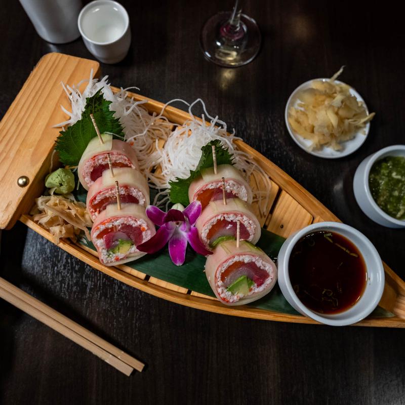 In: Fresh salmon & cucumber | Top: Fresh Tuna, avocado, Masago, scallions & ponzu sauce