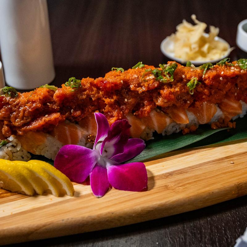 Tempura roll with salmon, cream cheese, avocado. Topped with crab salad, Sp. tuna, eel sauce, Sp. mayo, masago & green onions