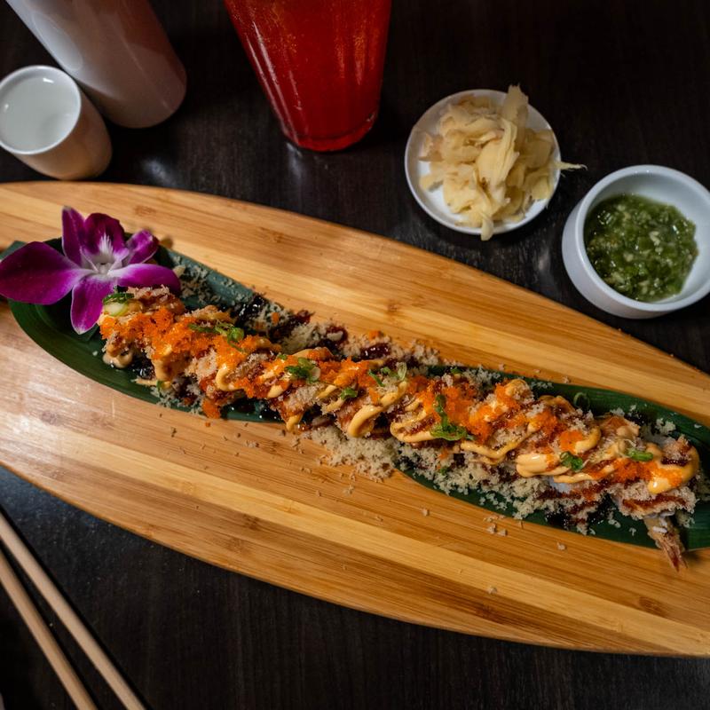 In: Shrimp Tempura, cream cheese & avocado | Top: Plantain Fried banana & sweet sauce