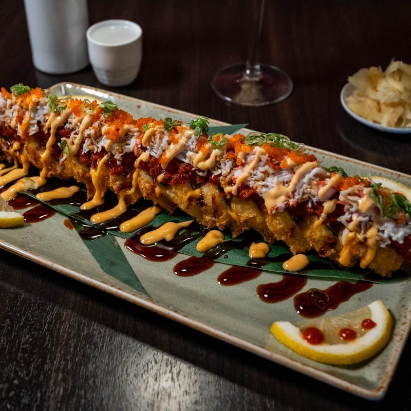 Tempura Style with Crab and Spicy Tuna, Topped with Eel Sauce & Spicy Mayo